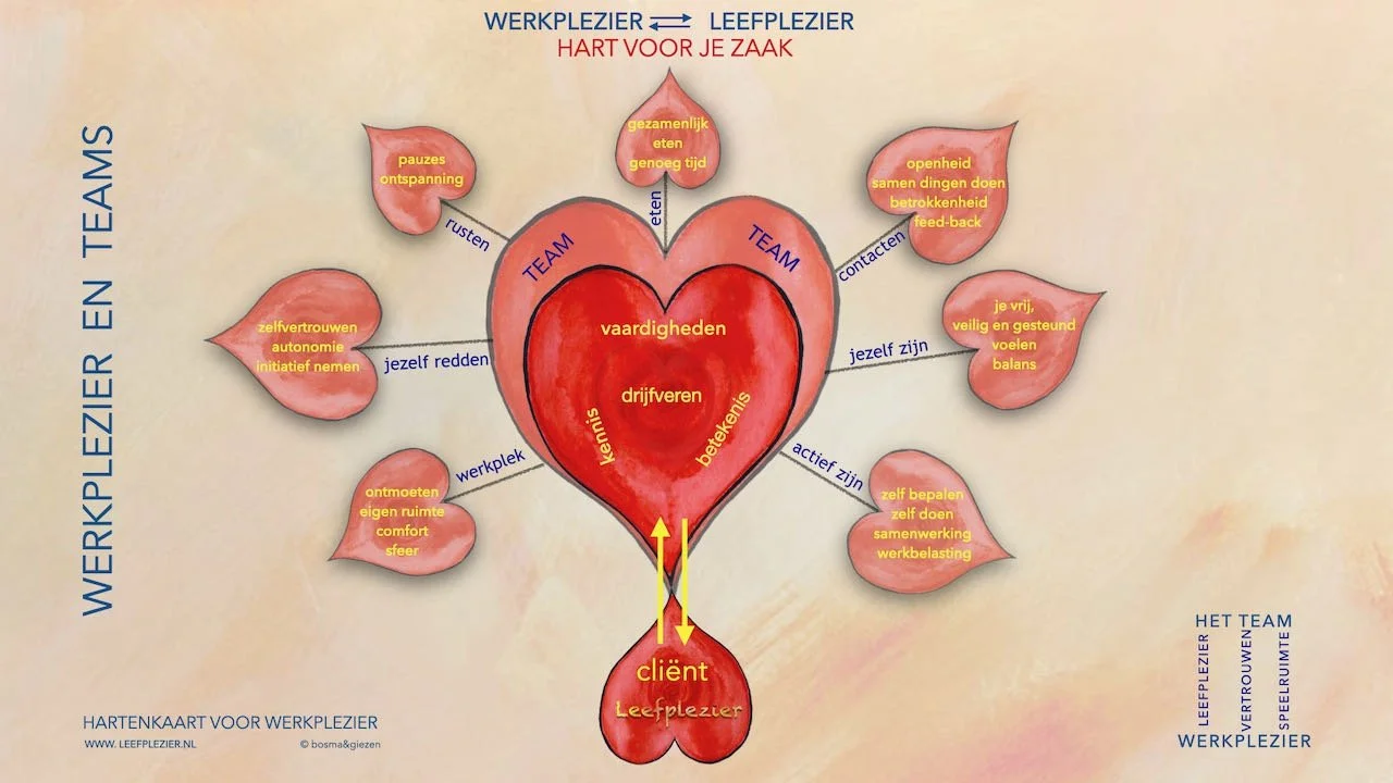 Vanuit hun praktijk ontstond de gedachte om de Hartenroos van Leefplezier te vertalen naar werkplezier. Een benadering die zowel het gehele team geldt als ieder individueel teamlid.